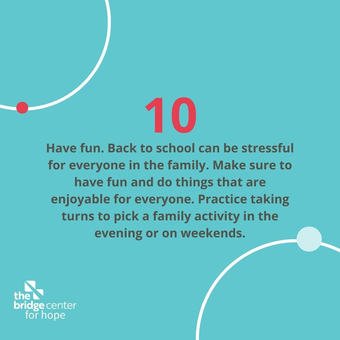 Back to school can be stressful for everyone in the family. Make sure to have fun and do things that are enjoyable for everyone. Practice taking turns to pick a family activity in the evening or on weekends.