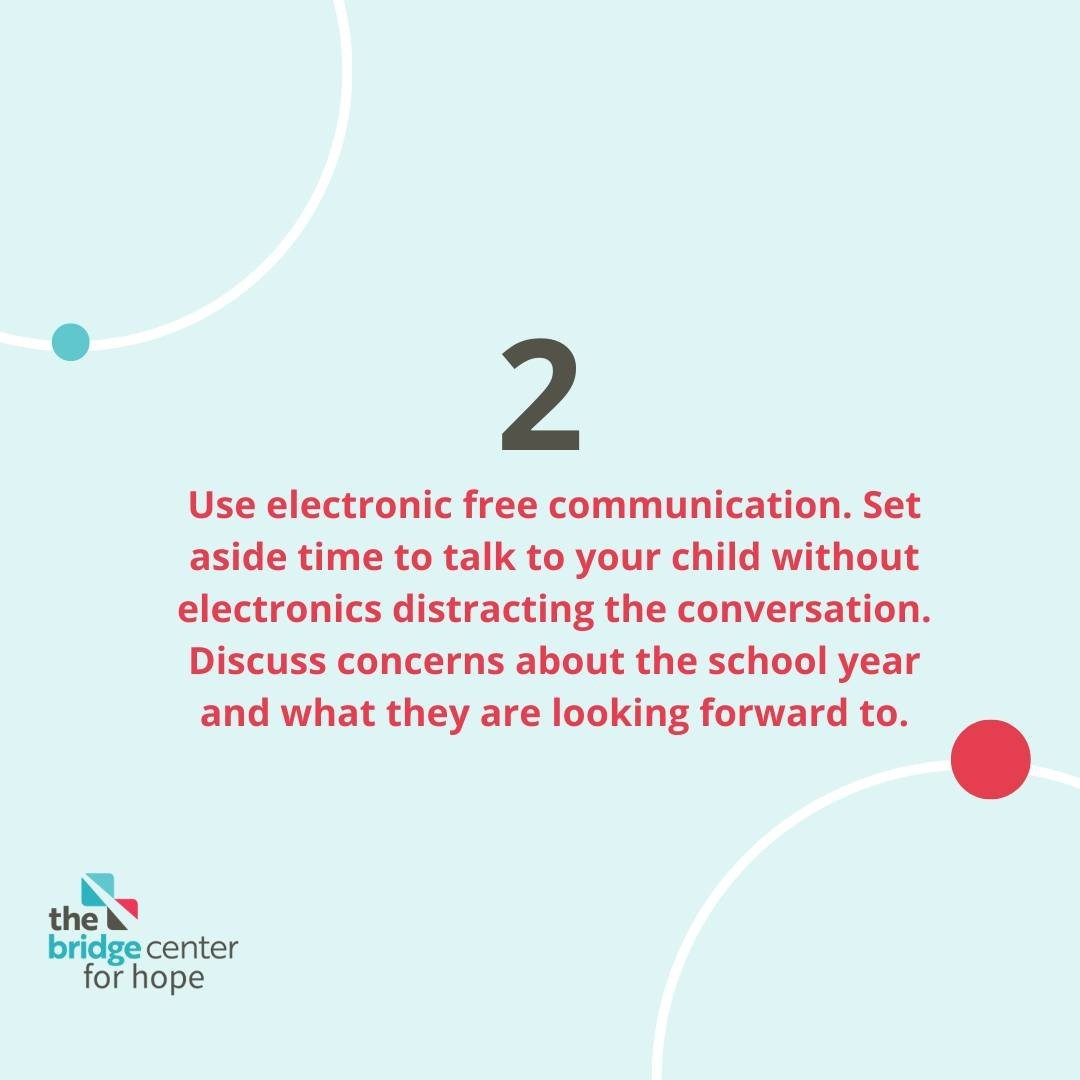 Set aside time to talk to your child without electronics distracting the conversation. Discuss concerns about the school year and what they are looking forward to.