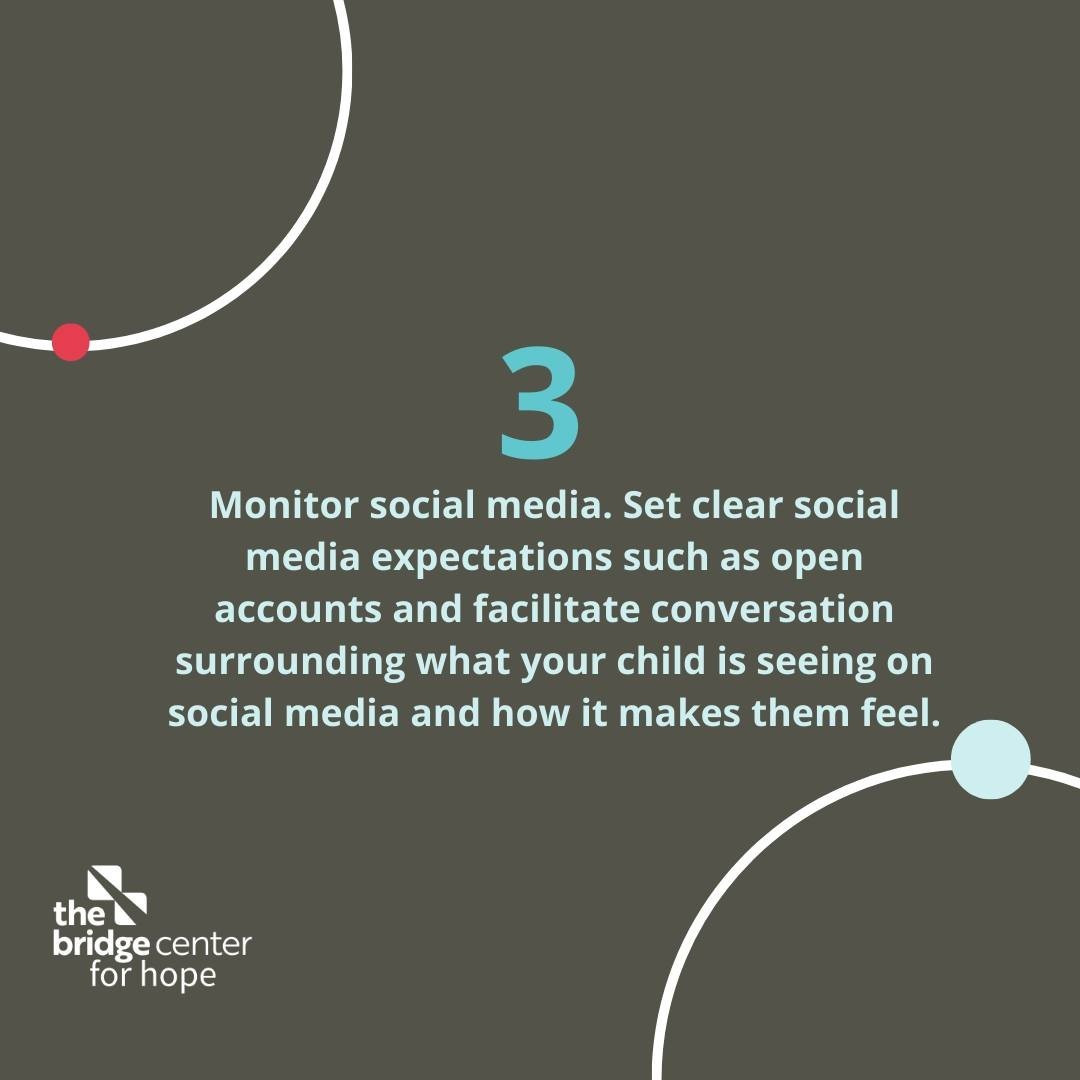 Set clear social media expectations such as open accounts and facilitate conversation surrounding what your child is seeing on social media and how it makes them feel.