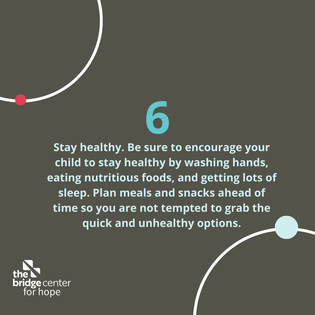 Be sure to encourage your child to stay healthy by washing hands, eating nutritious foods, and getting lots of sleep. Plan meals and snacks ahead of time so you are not tempted to grab the quick and unhealthy options.