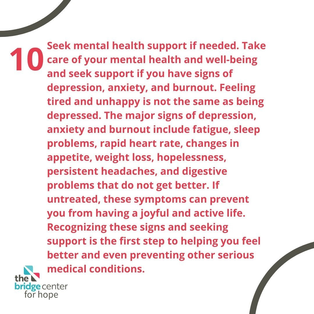 Take care of your mental health and well-being and seek mental health support if you have signs of depression, anxiety, and burnout. Feeling tired and unhappy is not the same as being depressed. The major signs of depression, anxiety, burnout, and other mental health problems that need specialized mental health attention include fatigue and sleep problems, rapid heart rate and breathing, feeling of danger, changes in appetite and weight loss, hopelessness, persistent headaches and pain, and digestive problems that do not get better. These symptoms, if not treated, can prevent you from having a joyful and active life. Recognizing these signs and seeking medical or psychological support is the first step to helping you feel better and even preventing other serious medical conditions.