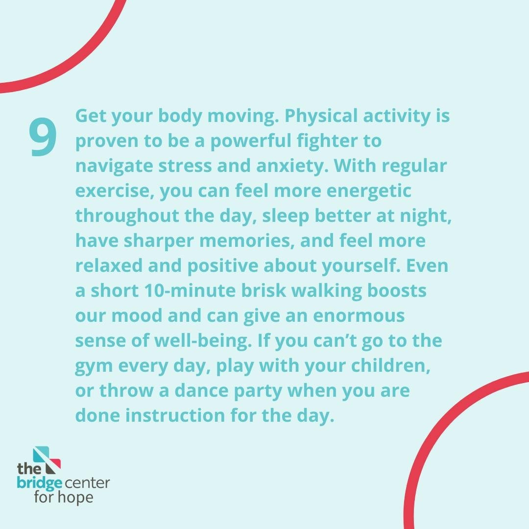 Physical activity is proven to be a powerful fighter to navigate stress and anxiety. With regular exercise, you can feel more energetic throughout the day, sleep better at night, have sharper memories, and feel more relaxed and positive about yourself. Even a 10-minute brisk walk boosts our mood and can give us an enormous sense of well-being. If you can't go to the gym every day, play with your children, or throw a dance party when you are done instructing for the day.
